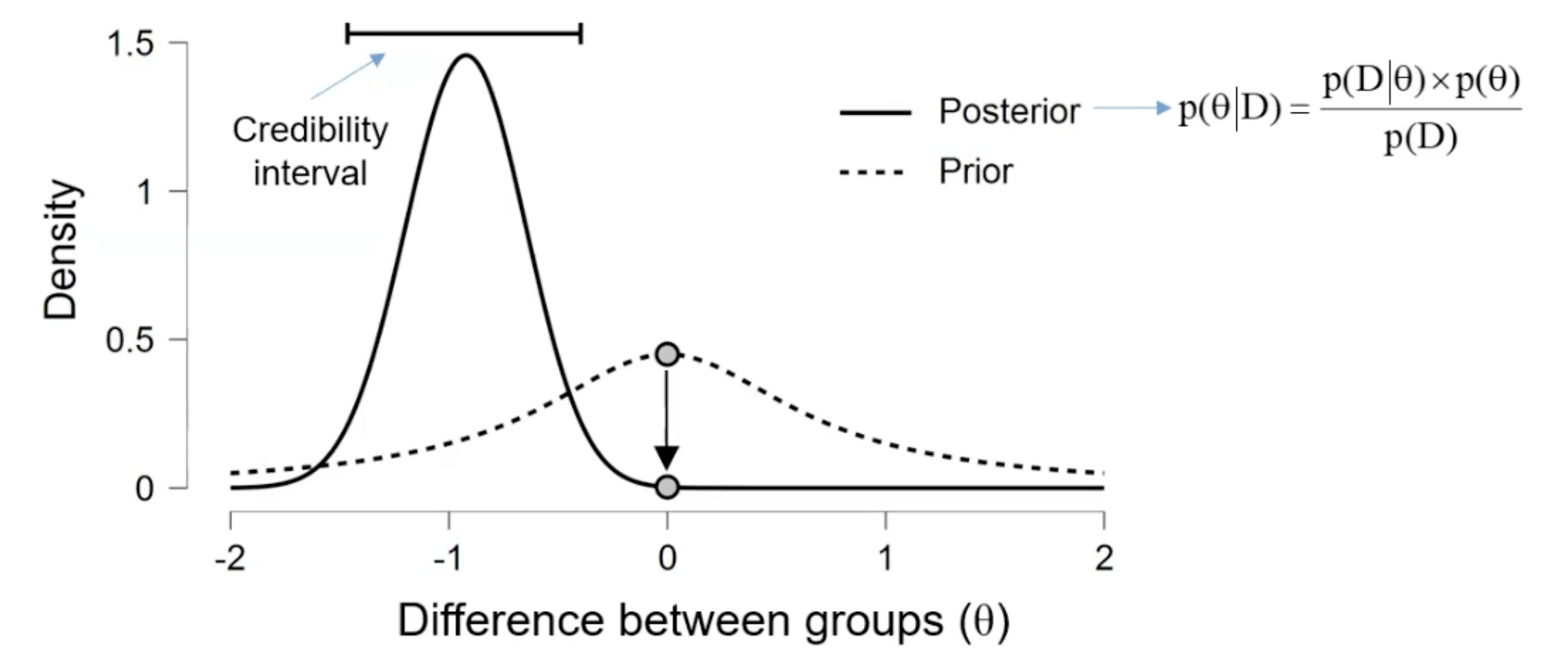It is a likelihood ratio of the data under two competing hypotheses, or the difference of the density for the reference value under the posterior and prior distribution. Contrary to p-values, Bayes Factors can provide evidence for both and .