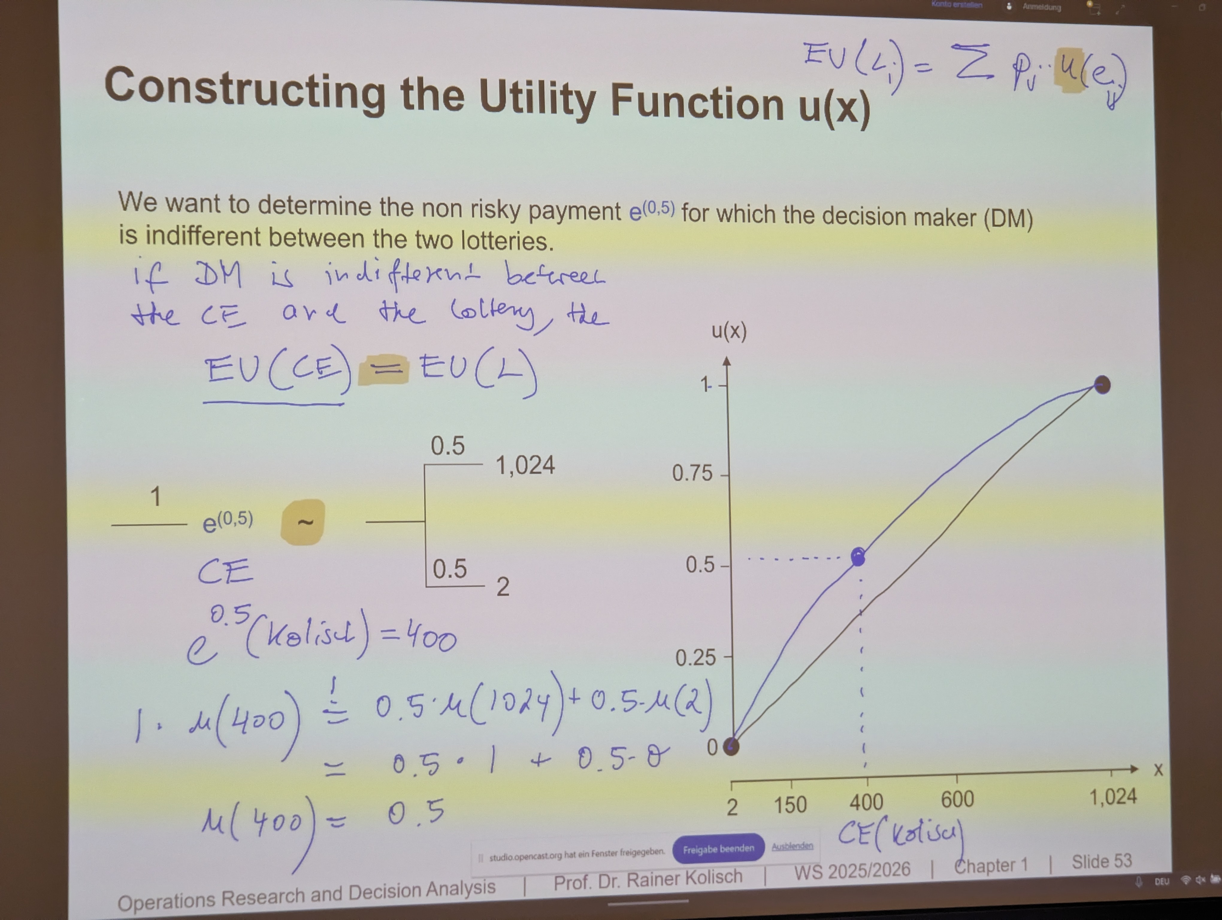 - If a Decision Maker (DM) is indifferent between a certain payment (CE) and a lottery (L), their utilities must be equal: .