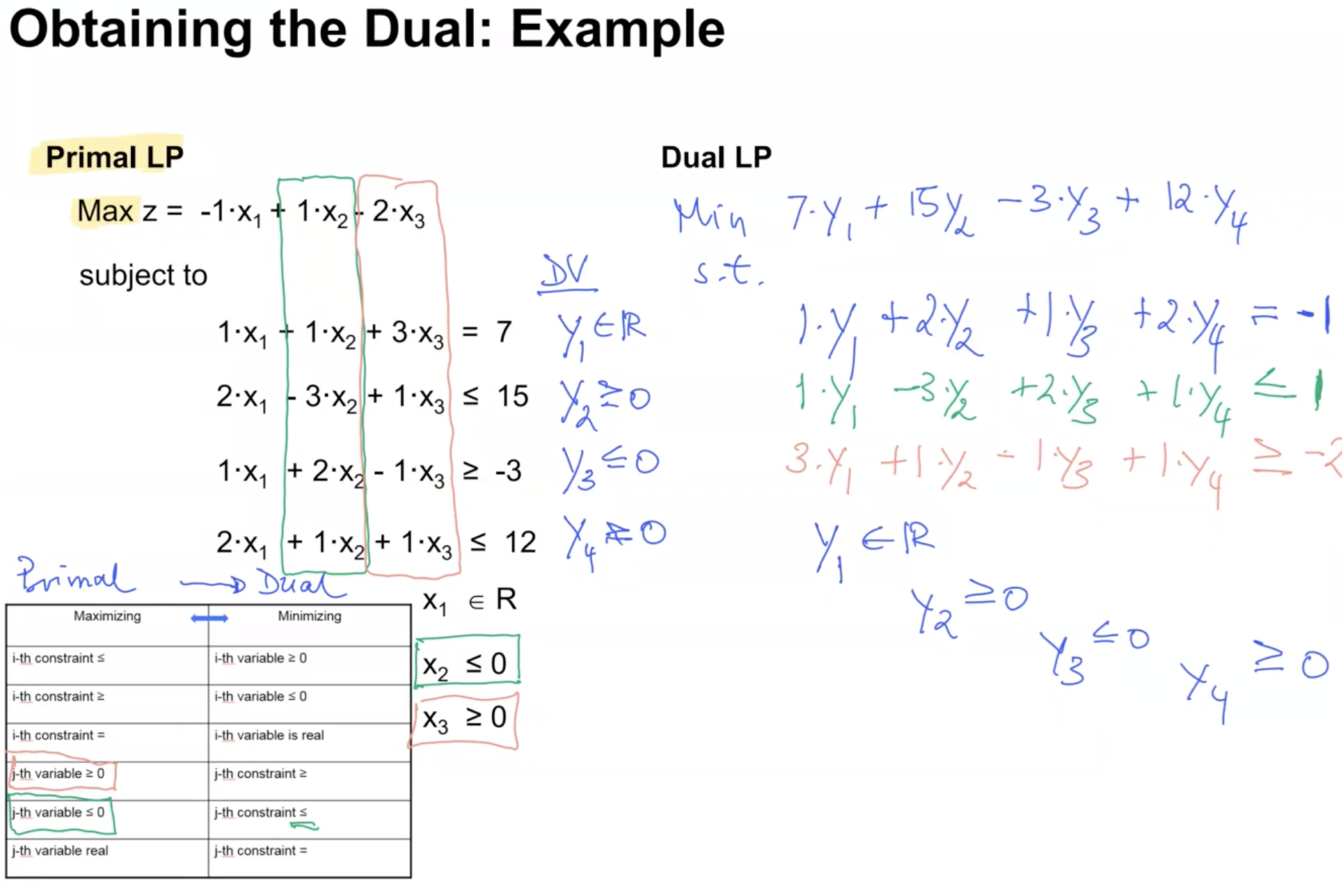 Each dual variable corresponds to a primal constraint, and each dual constraint corresponds to a primal variable. The dual variables are constrained based on the type of primal constraints, defined in the table above.