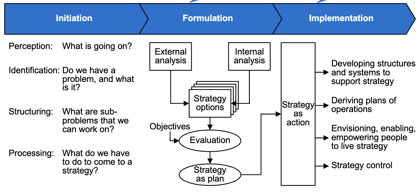 The overall strategy process can be structured as Analysis – Formulation – Implementation (AFI): external and internal analysis → strategic choices → putting strategy into action and building supporting structures.